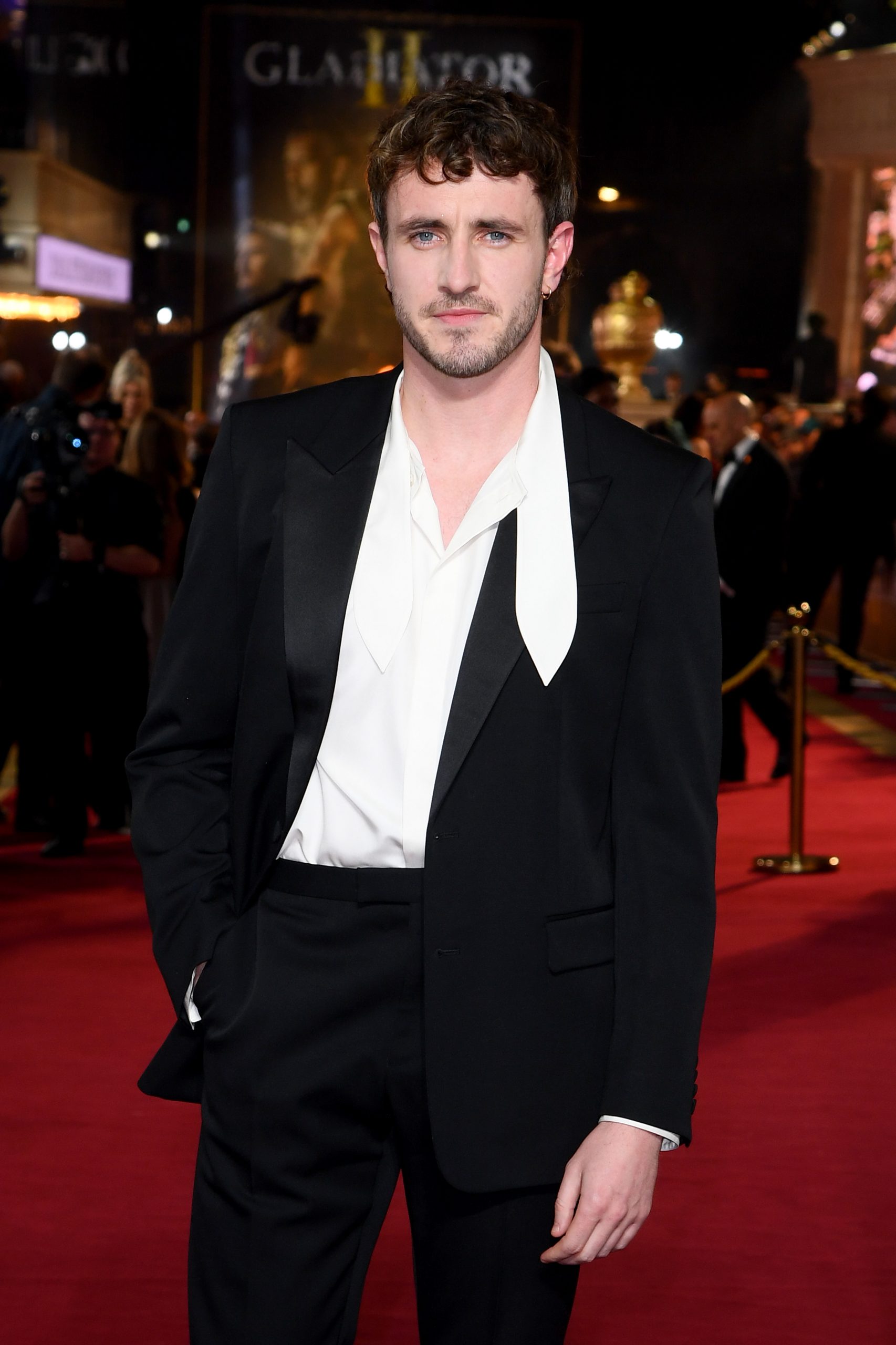 Накануне Пол Мескал предстал в Лондоне на премьере нового «Гладиатора 2» режиссера Ридли Скотта, где он сыграл главную роль. На показ актер выбрал классический смокинг Gucci с расслабленной светлой рубашкой. Но главным акцентом образа стал белый укороченный галстук, который его стилист Фелисити Кей предложила носить необычным способом, просто накинув сверху.