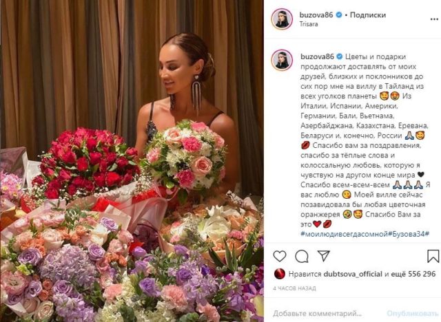 Ну а после вечеринки Ольга приехала в номер и поделилась с фанатами видео, где продемонстрировала количество цветов, которые ей присылали в течение дня со всех концов света. Бузова выложила благодарственный пост в Instagram и написала: «Спасибо за цветы и за любовь! Моей вилле сейчас позавидовала бы любая цветочная оранжерея!»