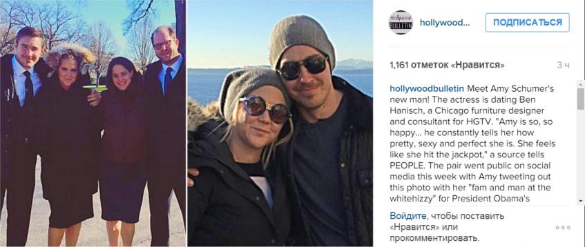 5 декабря Эми появилась в компании своего нового возлюбленного на официальной речи Барака Обамы (54) «о вооруженном насилии» в Белом доме. Зарубежным журналистам удалось узнать, что избранником артистки стал дизайнер мебели Бен Ханиш.