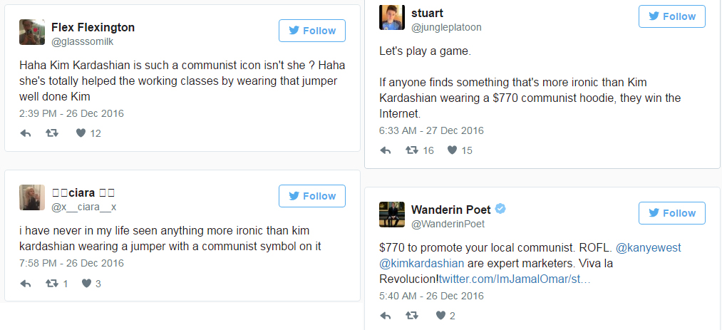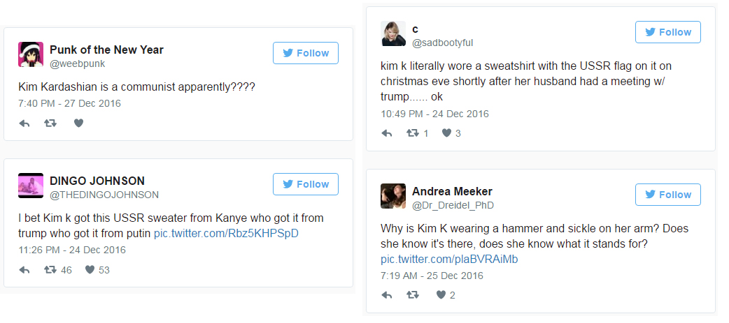 Twitter разрывается от количества комментариев к этому снимку. Кто-то отнесся к нему резко негативно, а кто-то – со здоровой иронией. Одни пишут: «Она вообще знает, что у нее на плече серп и молот? Она в курсе, что это значит?» А другие: «Вот это чувство юмора! Если кто-то найдет что-то смешнее, он будет королем Интернета».