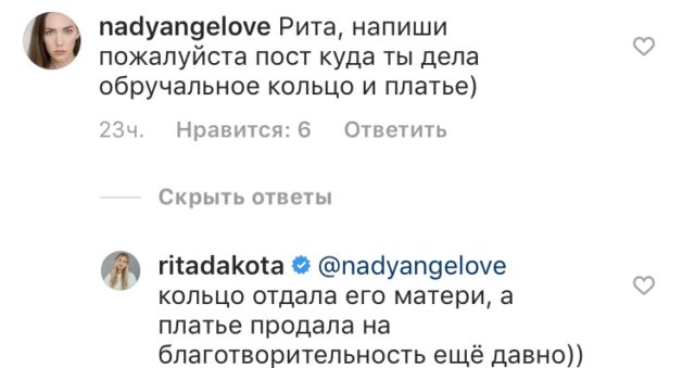На это Рита ответила: «Кольцо отдала его матери, а платье продала на благотворительность еще давно».