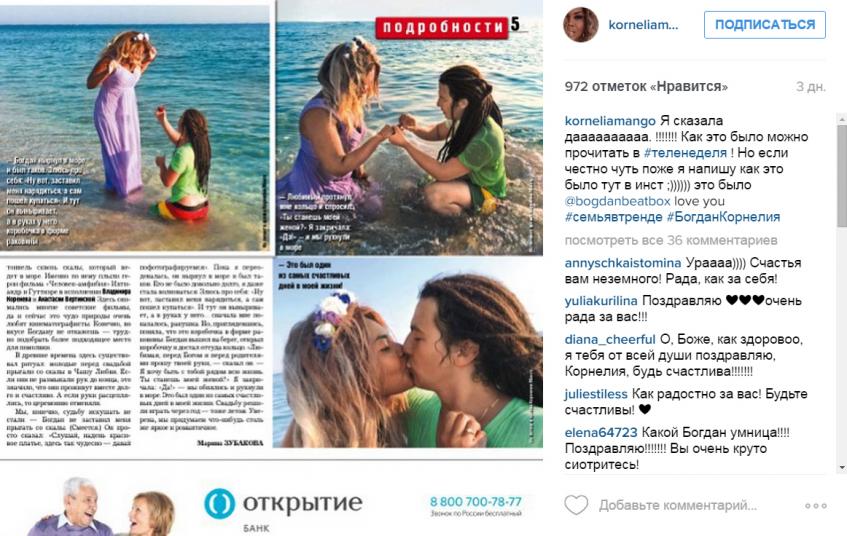 Уже достаточно давно ходят разговоры о скорой свадьбе Корнелии Манго (29) и ее возлюбленного Богдана Дюрдя. Всего несколько дней назад стало известно, что молодой человек сделал девушке предложение. Подробности пара старалась скрыть, но вскоре не стерпела. 14 августа Корнелия опубликовала в своем Instagram фото страницы из журнала «Теленеделя», которому она рассказала все о помолвке.