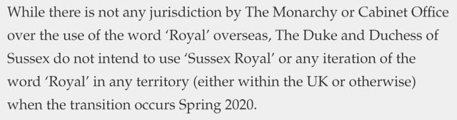«Хотя Королева или Кабинет министров не обладают какой-либо юрисдикцией в отношении использования слова «королевский» за границей, герцог и герцогиня Сассексские не намерены использовать Sussex Royal или какое-либо выражение этого слова на любой территории (либо в пределах Великобритании, либо иным образом), когда переход произойдет весной 2020 года», — говорится в заявлении.