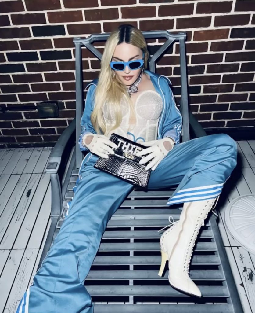 А именно – тандем корсета и спортивного костюма. И сочетание двух совершенно разных стилистик можно точно причислить к числу выигрышных союзов. Певица выбрала белый корсет с акцентным лифом, голубой спортивный глянцевый костюм с узнаваемыми тремя полосками и белые ботильоны с завязками, завершив аутфит на голубых очках, белых перчатках и массивных серебряных украшениях. Вишенка – цифровой термометр из эпохи-которую-нельзя-называть.