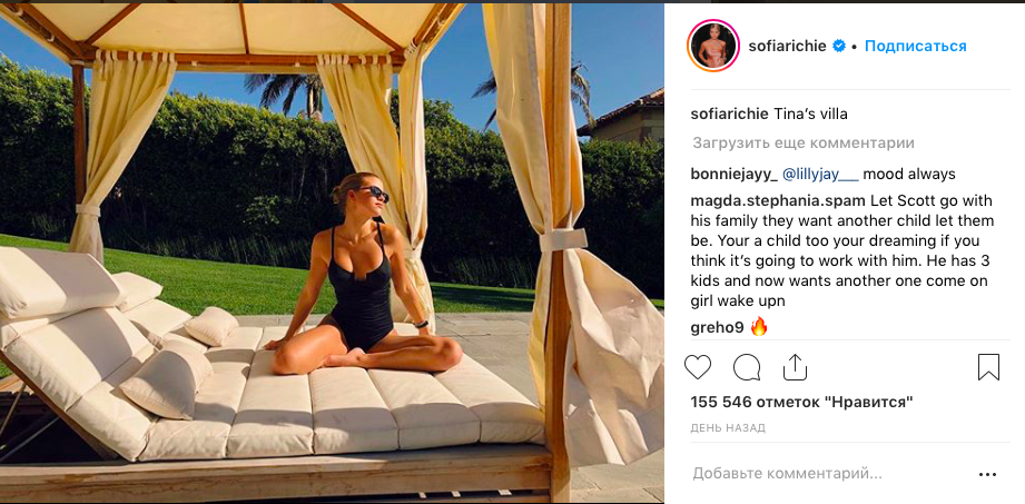 София Ричи, кстати, не унывает. Девушка Дисика выкладывает секси-фото c отдыха в купальнике. Подписчики, правда, уверены, что это просто жалкие попытки обратить на себя внимание Скотта: «Дай Скотту быть со своей семьей, если они хотят еще одного ребенка. Ты сама еще ребенок, если думаешь, что это сработает. У него трое детей, он хочет еще одного. Девочка, очнись».