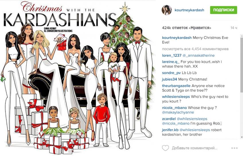 24 декабря Кортни Кардашьян (36) опубликовала в своем Instagram еще одну новогоднюю открытку, на которой запечатлены все представители прославленного семейства. В новогодний шарж попали даже Канье Уэст (38) и бывший муж Кортни Скотт Дисик (32), которые заняли почетное место на елке между смайликами KIMOJI.