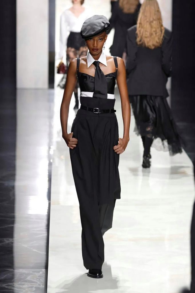 Возвращение аксессуара, конечно, не случайность – интерес к галстукам органично вписывается в общий камбэк тейлоринга. Но с важной оговоркой: теперь правила нужны скорее для того, чтобы их нарушать. В этом сезоне дизайнеры предлагают носить галстук расслабленно, иногда слегка небрежно – ослаблять узел, заправлять его в рубашку или брюки, носить на голое тело под жакет или позволять свободно ниспадать на плечи. В ход идут отсылки к эстетике 80-х и 90-х, power dressing и мужскому гардеробу, но через фильтр современной иронии и легкости. Стилизация максимально вариативна: галстук легко вписывается в образ с блузой, юбкой-карандашом и kitten heels, работает с макси-платьем и крупными украшениями и добавляет остроты черно-белым образам – особенно если выбирать трендовую модель с контрастной полоской. Для самых смелых – сочетание с ветровкой, трикотажным жилетом или даже легкой органзой.