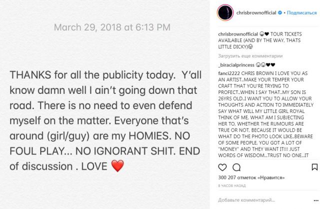 Естественно, снимки тут же облетели Интернет, а на Криса вновь полились обвинения в насилии. Он молчать не стал и написал в своем Instagram: «Спасибо за всю публичность сегодня. Вы все прекрасно знаете, что я больше не пойду по этой дороге. Мне даже не нужно в этом случае себя защищать. Все, кто рядом со мной, мои друзья. Никакой грязной игры. Конец обсуждениям». А адвокат Брауна заявил, что на фото Крис просто развлекается с подругой и душит ее в шутку, а TMZ грозит судебный иск.