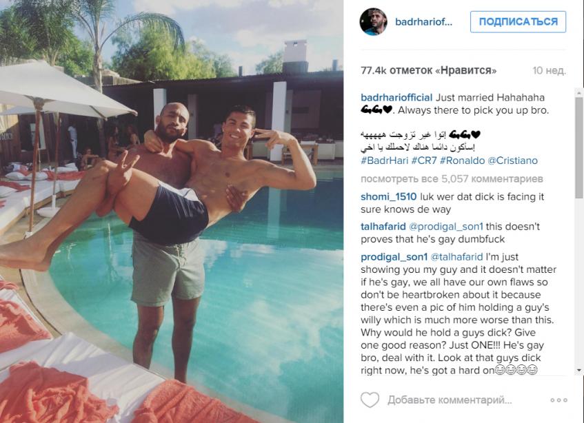 Совсем недавно вокруг Криштиану Роналду (30) разразился настоящий скандал. В прямом эфире французской передачи «Touche pas a mon sport» телеведущий заявил, что звезда футбола состоит в отношениях с голландским кикбоксером марокканского происхождения Бадром Хари (31) и уже потратил более $21 млн на частные перелеты к другу. Судя по всему, мнение журналиста может быть вполне обоснованным.