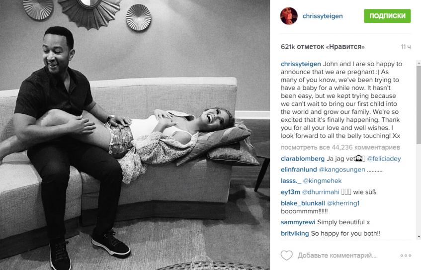 Об этом в своем Instagram сообщила Крисси, выложив фото, на котором запечатлена счастливая пара: «Джон и я счастливы сообщить, что скоро мы станем родителями. Многие из вас знают, что мы уже давно пытаемся завести ребенка. Было непросто, но мы продолжали надеяться, потому что не можем дождаться, когда сможем подарить миру нашего первенца и расширить семью. Мы очень счастливы от того, что скоро это произойдет. Спасибо за вашу любовь и поддержку! Я с нетерпением жду первых толчков в животе».