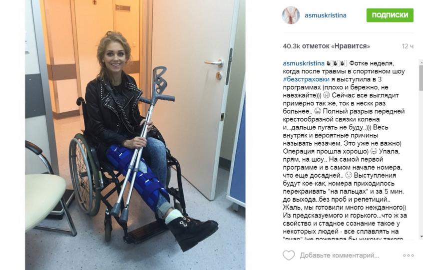 Об этом звезда рассказала поклонникам в своем Instagram, опубликовав фото из клиники: «Фотке неделя, когда после травмы в спортивном шоу #безстраховки я выступила в 3 программах (плохо и бережно, не наезжайте))) Сейчас все выглядит примерно так же, ток в нескк раз больнее.. Полный разрыв передней крестообразной связки колена и…дальше пугать не буду..))) Весь внутряк и вероятные причины называть незачем. Это уже не важно) Операция прошла хорошо) Упала, прям, на шоу.. На самой первой программе и в самом начале номера, что еще досадней.. Выступления будут кое-как, номера приходилось перекраивать "на пальцах" и за 5 мин. до выхода.. без проб и репетиций.. Жаль, мы готовили много нежданного))».