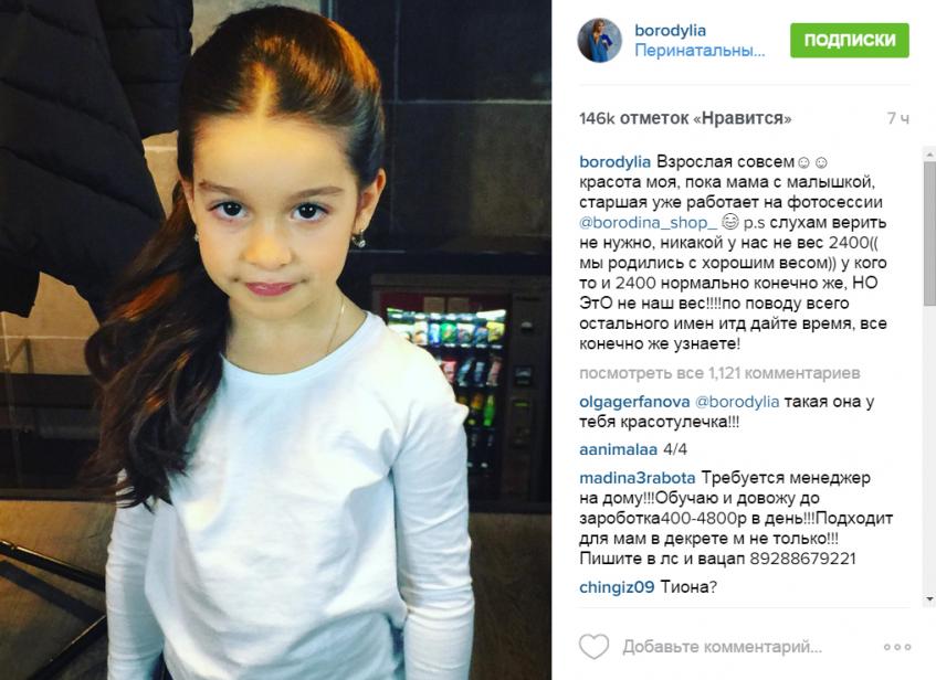 Ксения опубликовала в своем Instagram новое фото старшей дочки Маши (6) о ставила под ним послание ко всем подписчикам: «Взрослая совсем. Красота моя, пока мама с малышкой, старшая уже работает на фотосессии. p.s слухам верить не нужно, никакой у нас не вес 2400(( мы родились с хорошим весом)) у кого то и 2400 нормально конечно же, НО ЭтО не наш вес!!!!по поводу всего остального имен итд дайте время, все конечно же узнаете!» (орфография и пунктуация автора сохранены — прим.ред).