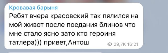 Собчак ответила у себя в «Кровавой Барыне». «Ребят, вчера Красовский так пялился на мой живот после поедания блинов, что мне стало ясно зато, кто героиня «Татлера». Привет, Антош», — написала Ксения.