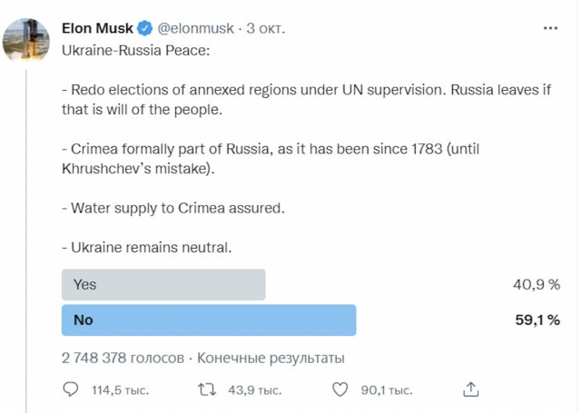 В своем сообщении предприниматель призывает заново провести референдумы под наблюдением ООН на территориях, недавно присоединившихся к России. В случае, если народ примет соответствующее решение, Россия должна уйти из этих регионов, добавил он. Маск также предложил признать Крым российской территорией, «как это было с 1783 года и до ошибки Хрущева», который передал полуостров в юрисдикцию Украинской ССР в 1954 году. В рамках будущих договоренностей Украина должна обеспечить водоснабжением Крымский полуостров и закрепить за собой нейтральный внеблоковый статус, заявил глава Tesla и SpaceX.