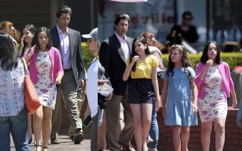 На фото со съемок, которые проходили 15 июля в городе Брентвуд (штат Калифорния), запечетлены Дэвид в амплуа Роберта и три юные актрисы, которые перевоплотились в сестер Хлои (31), Кортни (36) и Ким Кардашьян (34).