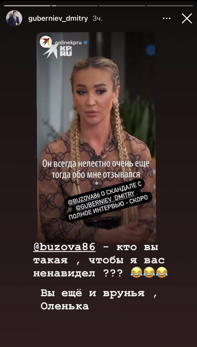 Губерниев опубликовал в сторис отрывок из интервью Бузовой для «Комсомольской правды», в котором телеведущая подробно рассказывает о скандале. По словам Ольги Бузовой, ее подставили и перед эфиром она не знала, что вести его будет именно Губерниев.