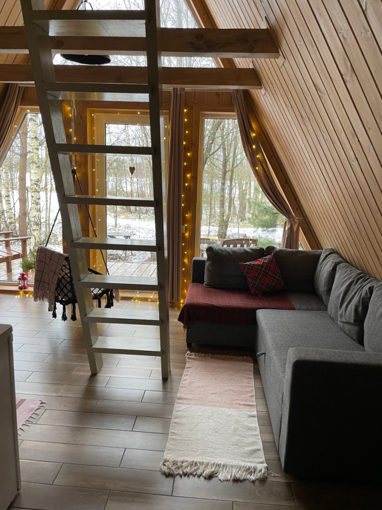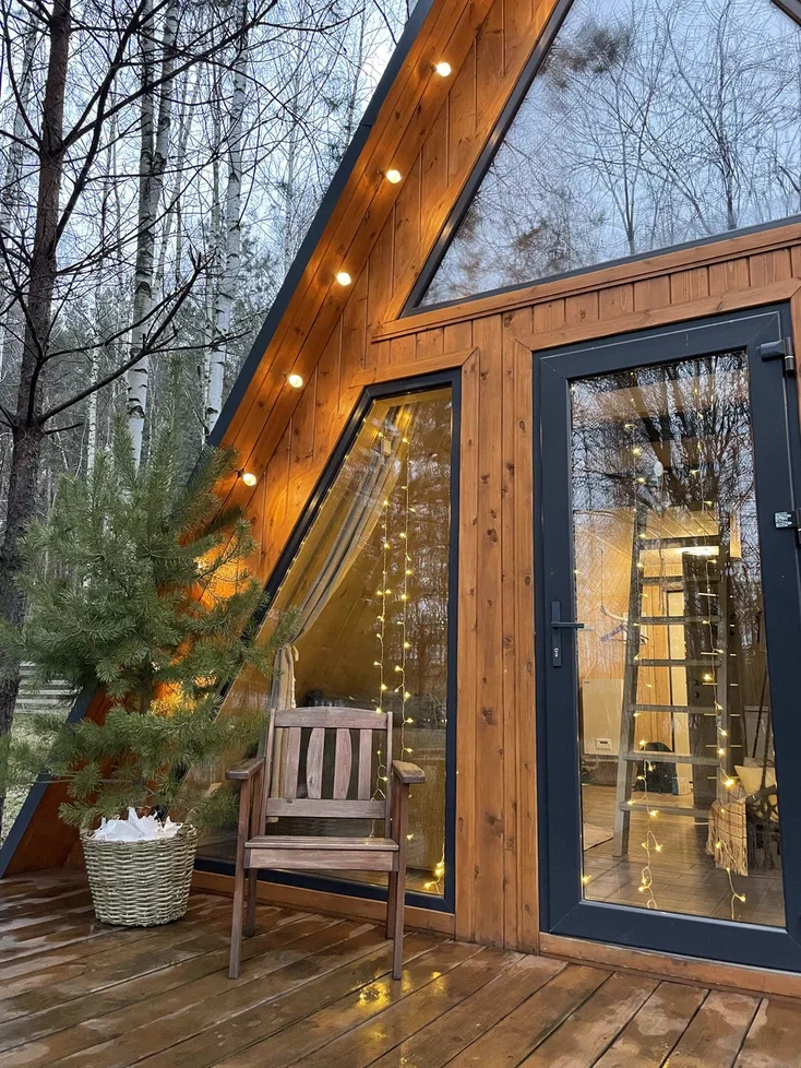 Один из самых «инстаграмных» и современных вариантов в нашей подборке. Здесь ты сможешь пожить в треугольных домиках с панорамными окнами с видом на лес. Перед входом есть небольшая терраса и барбекю-зона. Зимой она, правда, не так актуальна, но летом и весной – это просто идеальное дополнение. Кстати, сюда можно приезжать с домашними питомцами, что еще один плюс для гостей.