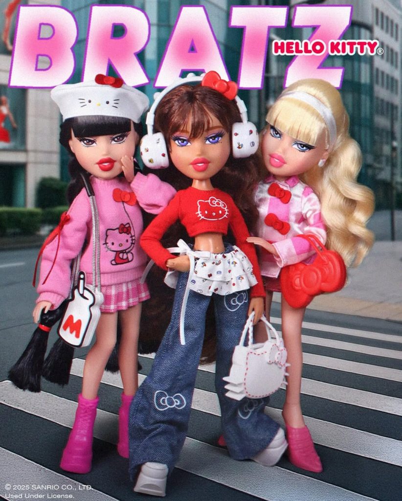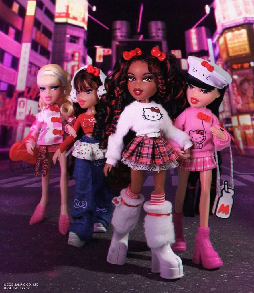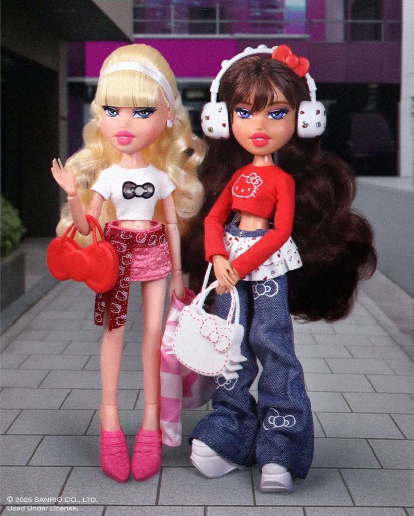 Дуэт, о котором никто не просил, но мечтали все – коллаборация Bratz и Hello Kitty. В роскошных, гипер-гламурных образах первыми появились любимые всеми Кло, Джейд и Ясмин. Поклонники встретили релиз с восторгом, однако отсутствие Саши стало поводом для негодования. Именно поэтому во второй части коллекции бренд исправил ситуацию, и Саша наконец заняла свое место в компании. Образы кукол воплотили все каноны гламурного стиля Y2K: мини-юбки, кроп-топы, свободные джинсы, укороченные свитшоты и главный аксессуар – сумочка в виде Hello Kitty, ставшая символом милоты и ностальгического шика.
