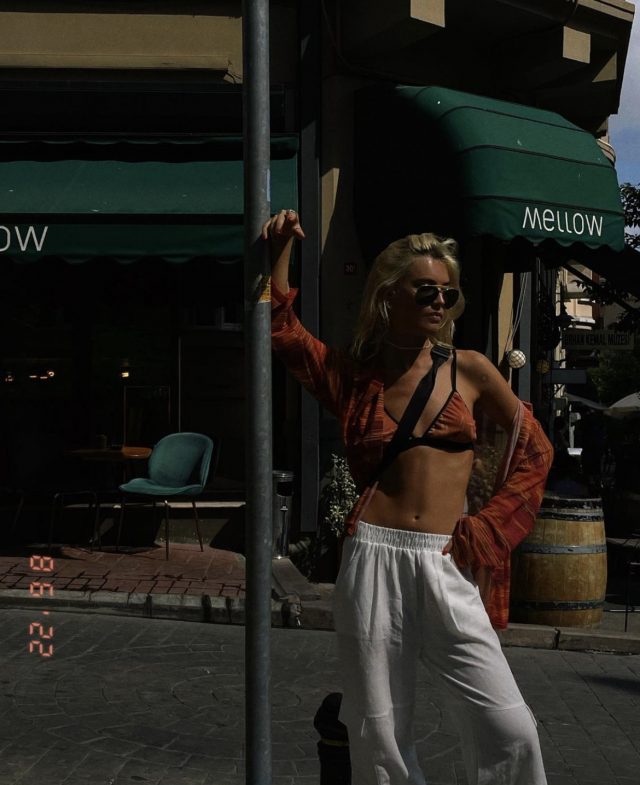 И, конечно, все дело в правильном аккомпанементе. Для городского образа Бильге выбрала оранжевый купальник с черной контрастной окантовкой бренда BGN, рубашку в тон и принт лифа, свободные белые брюки на низкой талии Bershka и винтажные солнечные очки. Ну а сумка через плечо от турецкой марки Muni Bum Bag добавила образу ноток стилистики сафари. Идеальный городской образ для последнего месяца лета готов. Да-да, мы тоже не верим, что сегодня 8 августа.