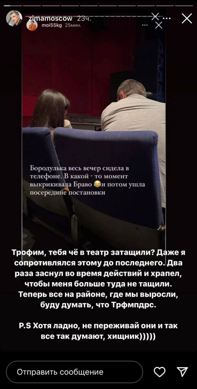 «Трофим, тебя че в театр затащили? Даже я сопротивлялся этому до последнего. Два раза заснул во время действия и храпел, чтобы меня больше туда не тащили. Теперь все на районе, где мы выросли, будут думать, что Трфмпдрс. P.S Хотя ладно, не переживай они и так все так думают, хищник», — написал предприниматель.