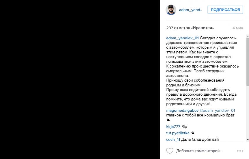 Адам принес свои соболезнования семьям погибших. «Сегодня случилось дорожно-транспортное происшествие с автомобилем, которым я управлял этим летом. Как вы знаете, с наступлением холодов я перестал пользоваться этим автомобилем. К сожалению, происшествие оказалось смертельным. Погиб сотрудник автосалона. Приношу свои соболезнования родным и близким. Прошу всех водителей соблюдать правила дорожного движения. Всегда помните, что дома вас ждут живыми родственники и друзья!» — написал спортсмен в своем Instagram.