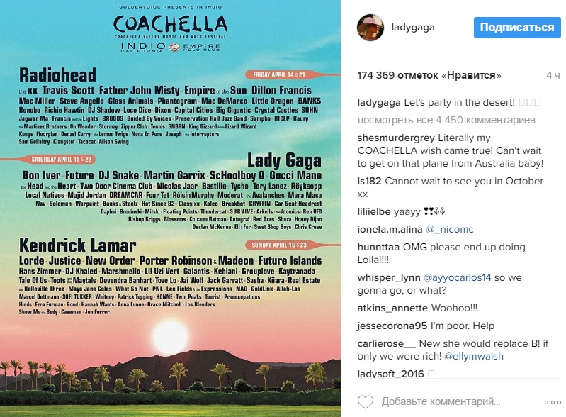 Сначала информация о замене появилась на сайте Billboard, а спустя несколько минут Леди Гага подтвердила слухи: певица выложила в свой Instagram афишу фестиваля.