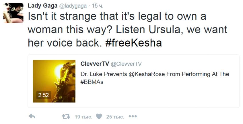 Она выложила в Twitter запись с хэштэгом #freeKesha (#Свободу Кеше): «Странно, что Кеша легально находится у него в собственности. Мы хотим снова услышать ее голос».