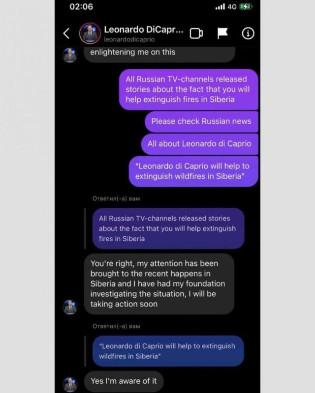 Ранее Леонардо ДиКаприо предложил якутским властям помощь в тушении пожаров после того, как к нему обратилась экоактивистка Роза Дьячковская. И, несмотря на их отказ, актер все равно намерен помочь в решении общей проблемы.