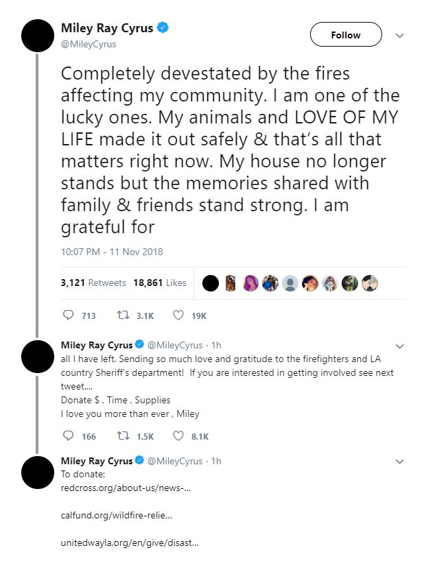 Майли Сайрус в Twitter сообщила, что ее дом тоже сгорел, но все животные целы и невредимы. Также певица поблагодарила пожарных, которые борются с огнем, и опубликовала список благотворительных организаций, которым можно перевести деньги, чтобы помочь тем, кто потерял свои дома в пожаре.