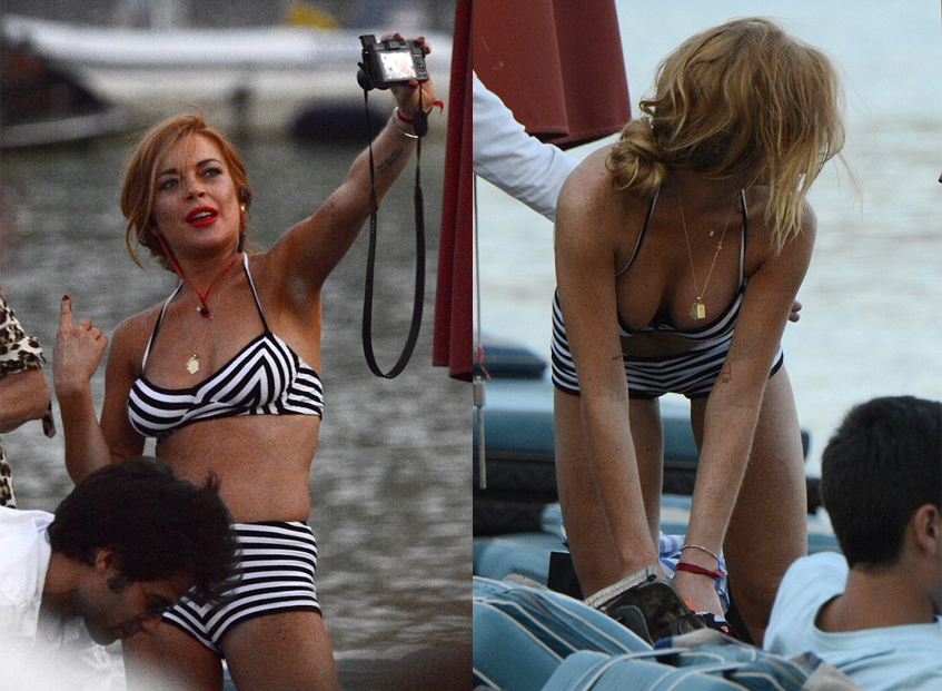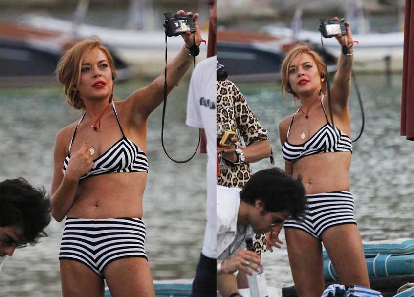 На прошлой неделе папарацци встретили актрису на греческом острове Миконос, где звезда отдыхала в компании друзей. Тогда Линдси попала в объектив фотокамеры сразу в двух нарядах. Первым актриса примерила купальник, состоящий из полосатых шортов с высокой талией и топа такой же расцветки. Как несложно заметить, этот наряд не очень красил фигуру звезды, только подчеркивая ее минусы.