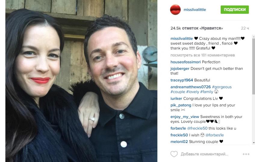 29 ноября в Instagram Лив появился снимок, на котором актриса запечатлена в компании своего избранника. Девушка положила руку на плечо Дейва, благодаря чему стало прекрасно видно шикарное обручальное кольцо с драгоценными камнями. «Схожу с ума от моего мужчины!!! Чудесный папа, друг, жених, спасибо тебе!!!» — написала актриса.
