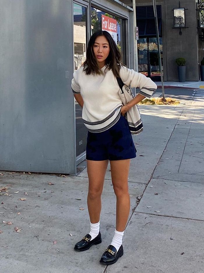А вот стилистам и модным блогерам нравится носить лоферы с бермудами, пиджаками и мини-платьями. В общем, в таких образах, как ты понял, весь акцент на ноги. Кстати, лоферы обожает Эльза Хоск. В ее Instagram мы насчитали минимум четыре образа в трендовой обуви. А лондонский стилист София Коэльо предлагает носить лоферы с капроновыми чулками и юбкой-блейзером.
