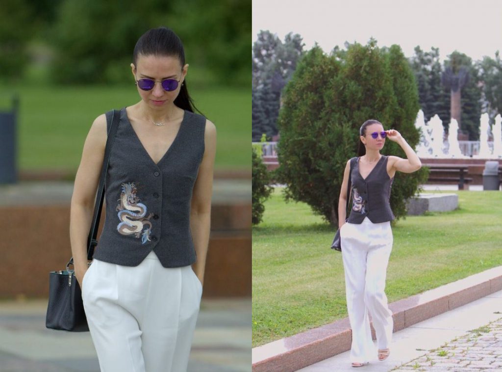 В чем: брюки и жилетка Steam Tailor, сумка Louis Vuitton, очки Ray Ban.