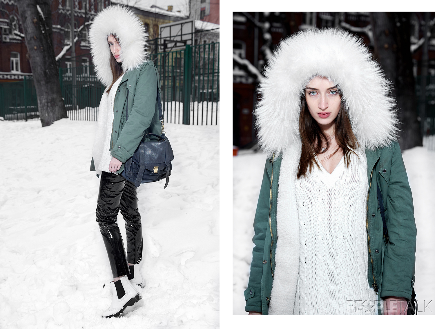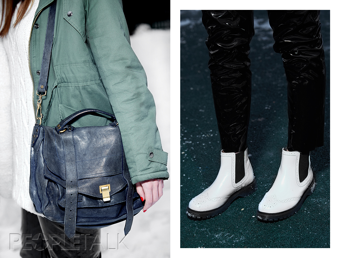 Моей парке No Name всего два года, но, кажется, я буду носить ее как минимум ещё два — супер теплая и красивый белый мех, который заслуживает отдельного внимания. Свитер я взяла у мамы просто потому, что он тёплый и длинный: в такую погоду ничего лучше и не придумаешь. Виниловые брюки H&M — хотела такие давно, еле успела забрать последние, пусть и не свой размер. А вот ботинки Bronx каждый день надевать не смогла бы — выглядят они лучше, чем носятся.