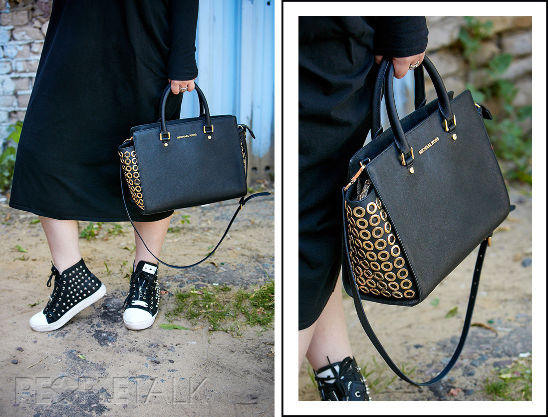 Кеды Chasse – моя гордость. В первую очередь потому, что они выглядят просто бомбически: кожа, шипы. Все как я люблю. А во-вторых, потому что я отхватила их со скидкой 70%. Ну и, конечно, классическая сумка Michael Kors – и в пир, и в мир.