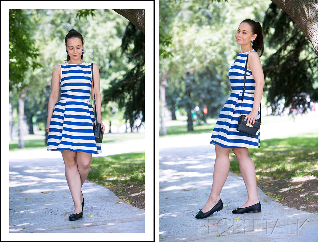 Платья обожаю и ношу их в неограниченном количестве. Яркие цвета выношу в особую категорию пристрастий – удачное сочетание классических сине-белых полос правильной ширины и платье на каждый день, купленное на одном из дизайнерских маркетов в Москве (молодой бренд MaSha Project).