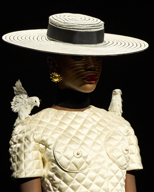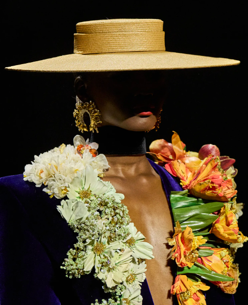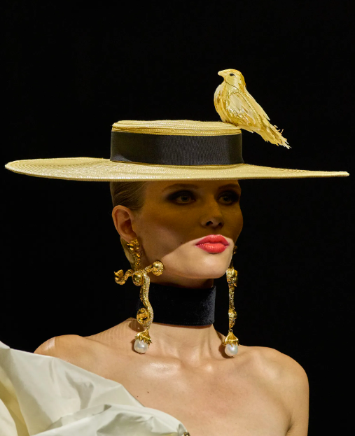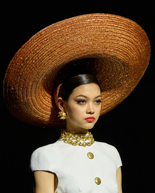 На показе Schiaparelli визажисты отдали власть свету и тени, которые то и дело определяли, кому отдать главную роль. Поэтому, когда широкие поля шляп отбрасывали тень на глаза, в центре внимания были красные губы или высокие скулы. И, кстати, моделей красила Пэт МакГрат — легенда среди визажистов.