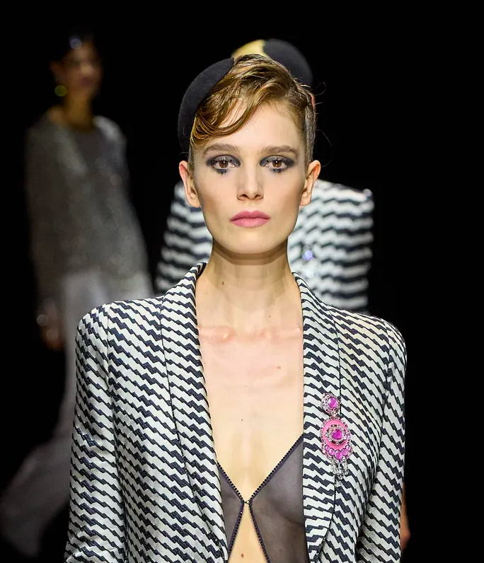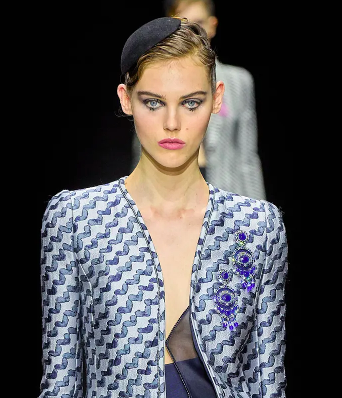 Визажисты Armani Privé в этот раз приятно удивили. На моделях были черные смоки, но не те, к которым мы привыкли. Тени дополнили блестками и рисунками подводкой. Вместе с нюдовыми матовыми губами (кстати, глянцевого блеска на подиуме почти что не было замечено) и четкими скулами смотрелось гармонично.