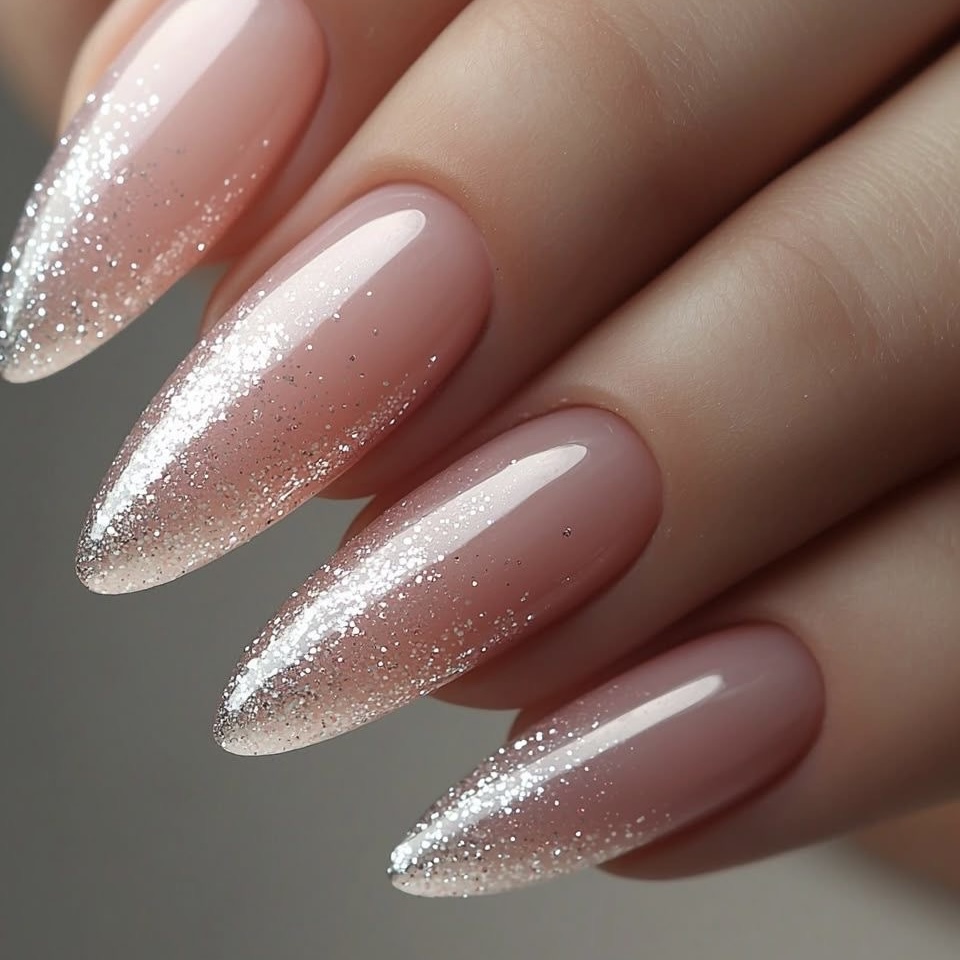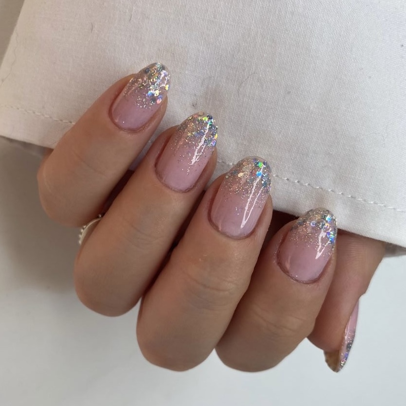 Это нюдовый нейл-арт с серебряными блестками, которые переливаются и напоминают «камень предвидения». Чтобы получить тот самый эффект сияния, мастера сначала используют розово-молочный лак, а после только на верхнюю часть ногтя наносят серебряный топ и с помощью тонкой кисти создают узоры.