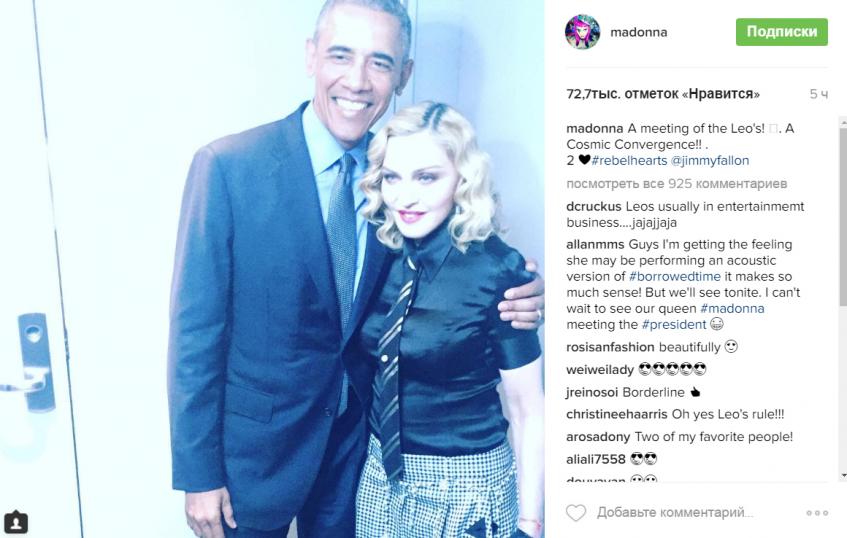 Стоит отметить, что, несмотря на то что программа с участием политика и певицы выйдет только вечером, Мадонна уже завалила Instagram снимками с первым лицом Соединенных Штатов. «Встреча львов! Космическая конвергенция!» — замысловато подписала один из снимков певица.