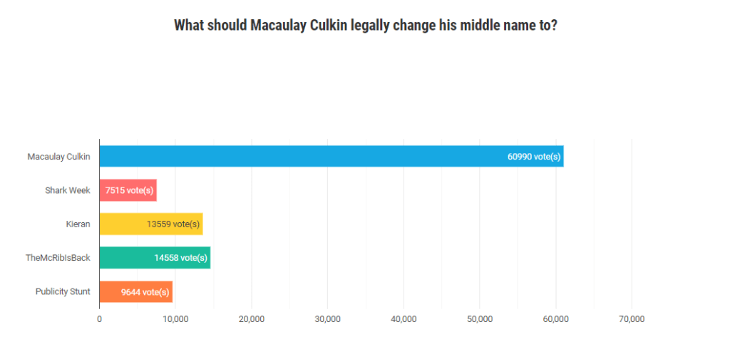 На своем официальном сайте Калкин предложил несколько вариантов: Маколей Калкин, Шарк Уик (в честь телешоу Shark Week), Киран (в честь брата), ЗеМакРибИзБэк (мем TheMcRibIsBack) и Паблисити Стант («рекламный трюк»). С огромным отрывом победил вариант «Маколей Калкин».