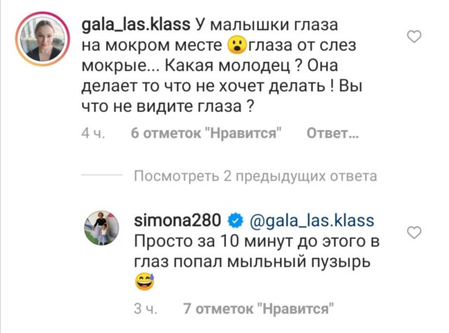 Однако пользователи заметили заплаканныq вид девочки. «У малышки глаза на мокром месте. Она делает то, что не хочет делать!», — написали в комментариях. Но мама Тимати сразу заверила: все в порядке! «Просто за 10 минут до этого в глаз попал мыльный пузырь. Я думала, не справится, но Алиса молодец!»