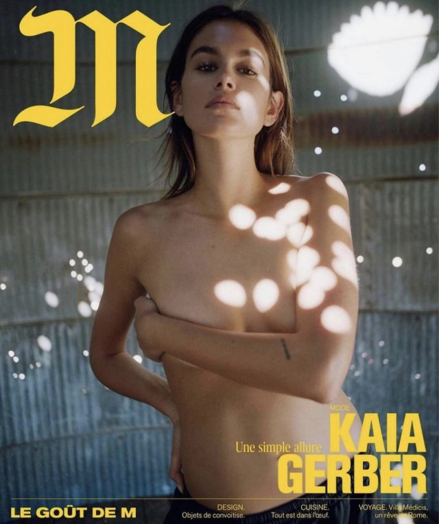 Дочь Синди Кроуфорд позировала в одних брюках. Кайя прикрыла грудь руками и пристально смотрела в объектив. На ней был минимум косметики, а волосы небрежно были спрятаны за уши.