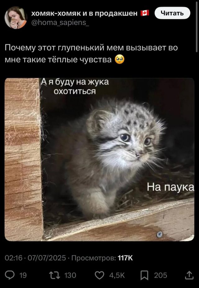Тренды с милыми животными уже не раз покоряли Интернет. На смену бобрам и свинкам пришел новый мем – на этот раз с манулом: «А я буду на жука охотиться. На паука».