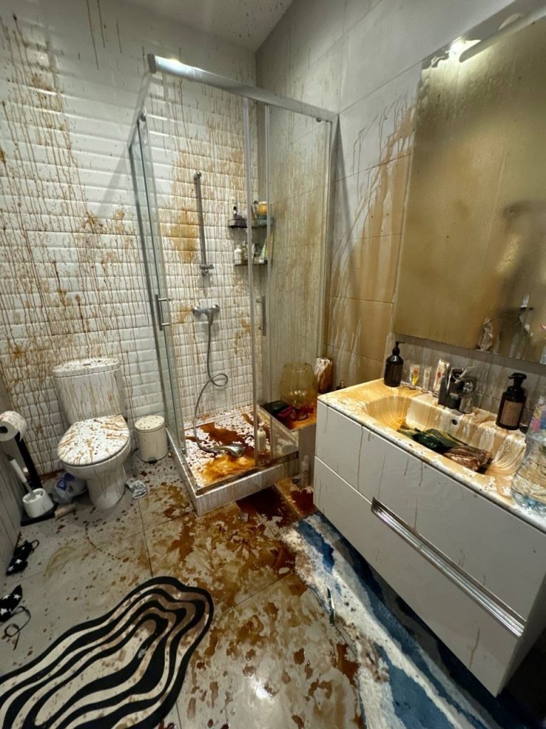 Блогерша Мария Горячева опубликовала в своем Telegram-канале шокирующее фото. На кадре ванная комната, полностью облитая темной жидкостью.