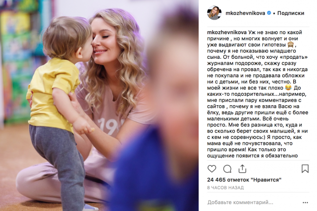 И сегодня она впервые прокомментировала слухи о том, почему она это делает. Актриса выложила в Instagram снимок с сыном, на котором его видно со спины, и написала: «Уж не знаю по какой причине, но многих волнует и они уже выдвигают свои гипотезы, почему я не показываю младшего сына. От больной, что хочу «продать» журналам подороже, скажу сразу обречена на провал, так как я никогда не покупала и не продавала обложки ни с детьми, ни без них, честно. В моей жизни не все так плохо. До каких-то подозрительных… например, мне прислали пару комментариев с сайтов, почему я не взяла Васю на ёлку, ведь другие пришли ещё с более маленькими детьми. Всё очень просто. Мне без разницы кто, куда и во сколько берет своих малышей, я ни с кем не соревнуюсь:) Я просто, как мама ещё не почувствовала, что пришло время! Как только это ощущение появится я обязательно всех познакомлю с замечательным мальчиком Василием Васильевым) Так же отвечу на популярный вопрос на кого похож?! В этот раз сын не обидел ни маму, ни папу и похож сразу на двоих:) Надеюсь, я смогла, хотя бы немного утешить Ваше любопытство, всем добра» (Орфография и пунктуация автора сохранены — Прим. ред.).