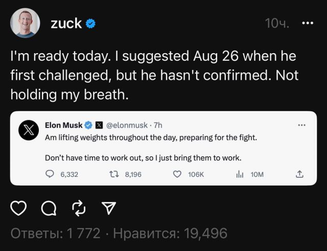Марк Цукерберг заявил, что готов провести бой с владельцем Twitter 26 августа, но тот еще совсем не готов. Кстати, Илон просил даже Хабиба Нурмагомедова подготовить его, только вот боец отказался.