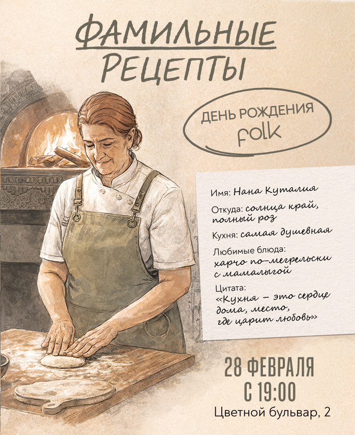 28 февраля Folk отметит четырехлетие в лучших традициях грузинского застолья. Будут приготовлены блюда по аутентичным рецептам: хачапури по-аджарски, фирменный мегрельский сациви с курицей, хинкали.
