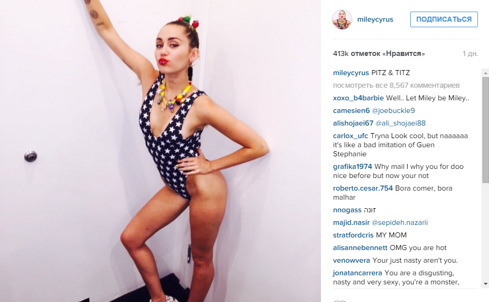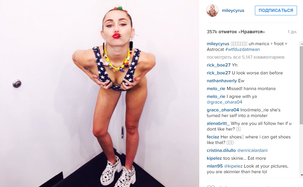 Мы уже рассказывали о том, что Майли решила не брить подмышки. Это она уже давно демонстрирует во всех соцсетях. И, видимо, звезда не на шутку увлеклась этой идеей. Сайрус поделилась в своем Instagram очередным фото, где она в ярком откровенном наряде и… с небритыми подмышками! На что ее поклонники сразу же начали оставлять тысячу комментариев.