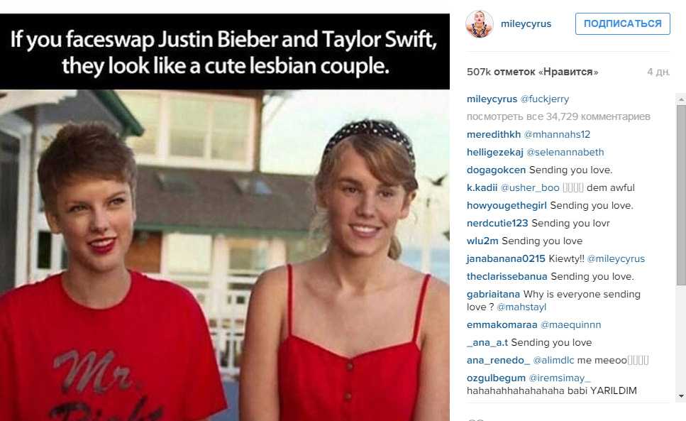 Но не забыла Майли и про своих коллег. Ранее она выложила в свой профиль фото, на котором под раздачу попали и Тейлор Свифт (25) с Джастином Бибером (21).